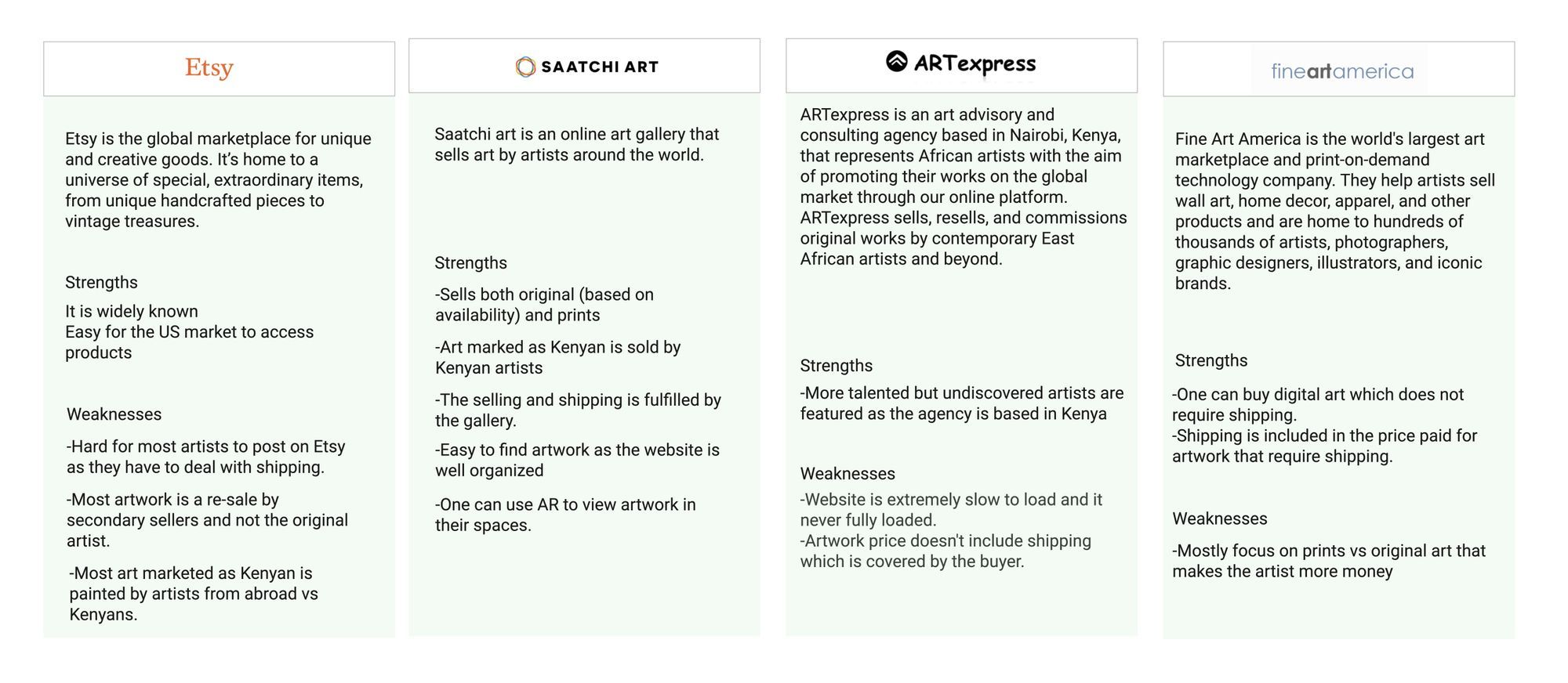 Secondary research was conducted to evaluate existing online art marketplaces and identify patterns in artist representation, content categorization, and discovery mechanisms. I reviewed multiple platforms to understand how “African Art” is labeled, surfaced, and sold, with a specific focus on the visibility of East African artists within these ecosystems.