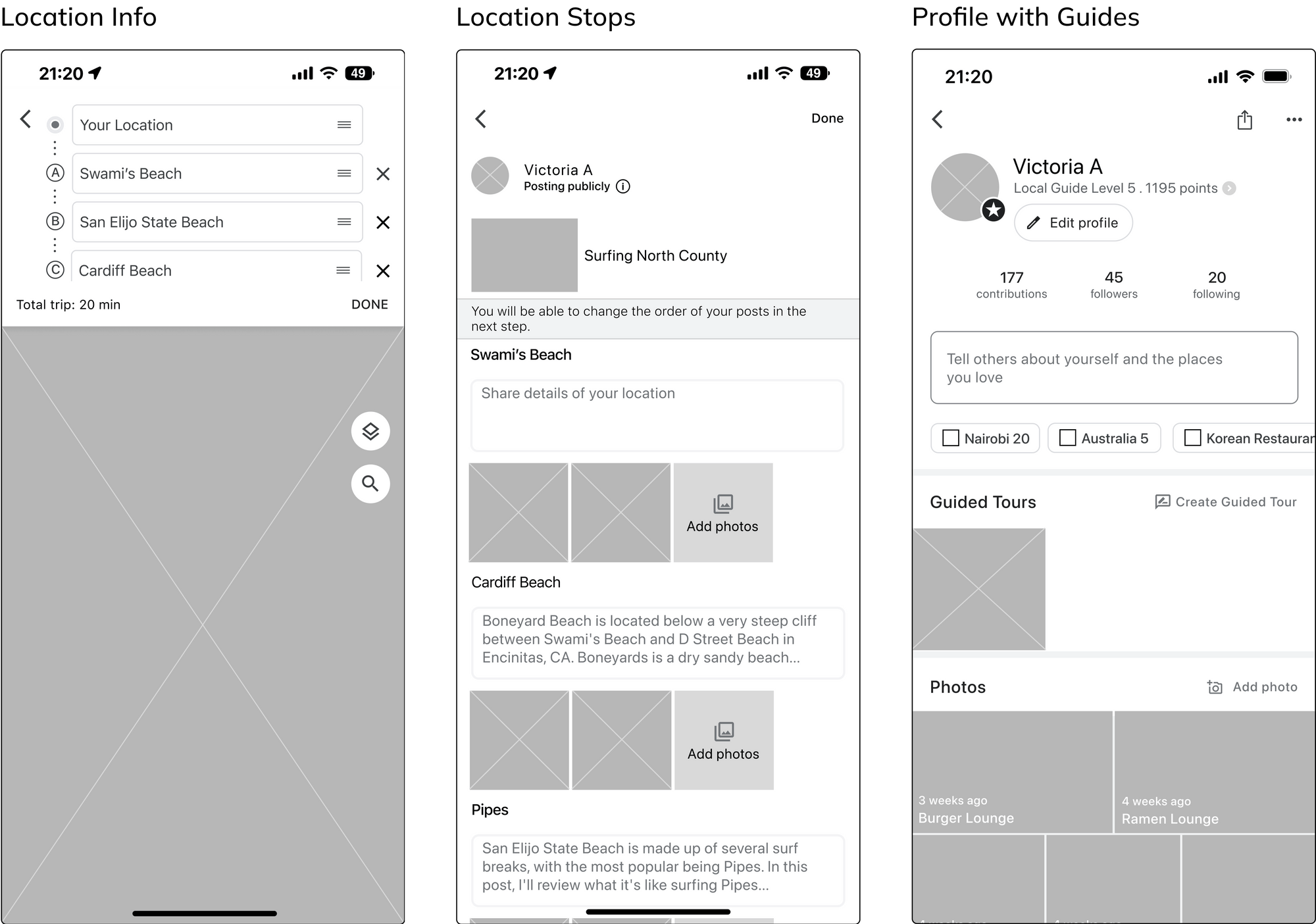 After researching Google Maps and defining my personas, the next step was to create the lo-fidelity wireframes to plan out the screens for the experience. I made sure to follow all of Google’s UI Design Patterns throughout my process.
