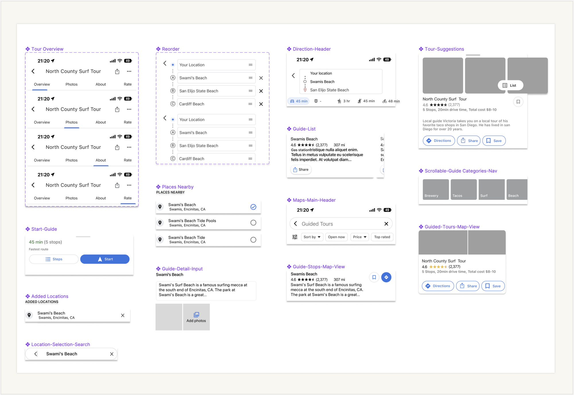 Designed a “Guided Tours” feature that allows users to search for curated experiences such as food, beaches, or attraction assembled by locals. These pre made tours guide users through specific areas (e.g., “Beaches in Orange County”), delivering a streamlined, experience-driven way to explore.