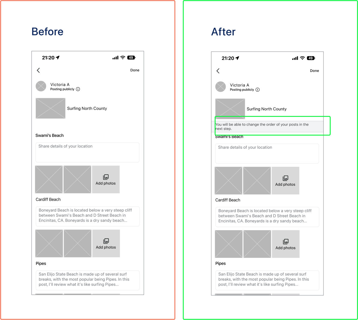 During testing, some users expressed their dissatisfaction by the way their post order was after selecting all the locations. They attempted to go back and redo the location search in the order that they wanted the posts to appear. They did not know that they could change post order in the next step.There was no clear communication that it was possible in the coming steps.I made the change by clearly stating on the screen that the post order is possible in the next step.