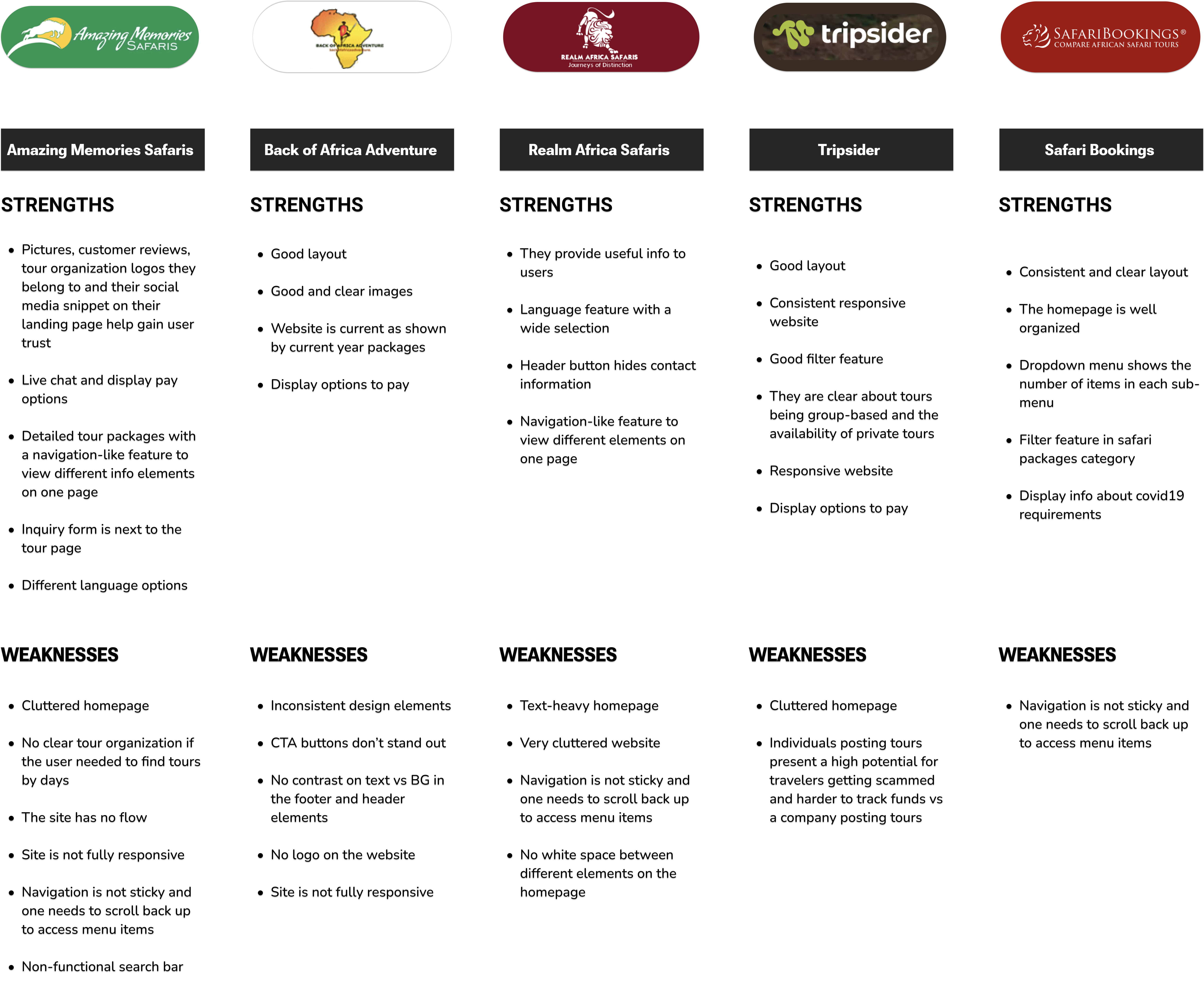 I conducted competitive and comparative analysis of similar tour and travel websites to understand current market patterns, common features, and best practices. This helped establish a baseline for industry standards and identify opportunities to differentiate the Mzingo Adventures experience.